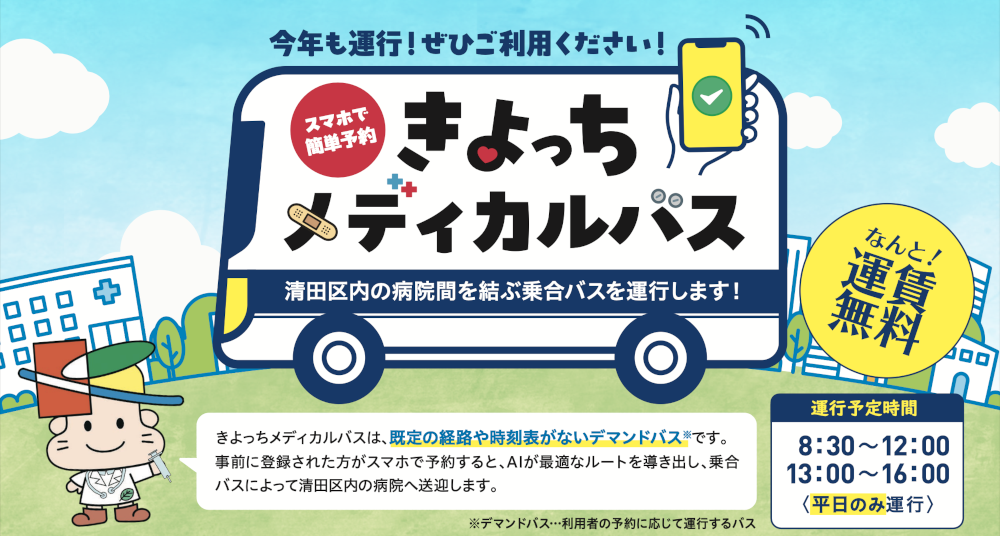 ただいま、清田区内の各病院を結ぶ「きよっちメディカルバス」が運行中です。(令和8年1月31日までの予定)